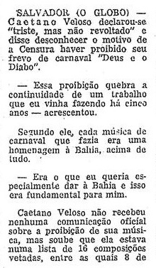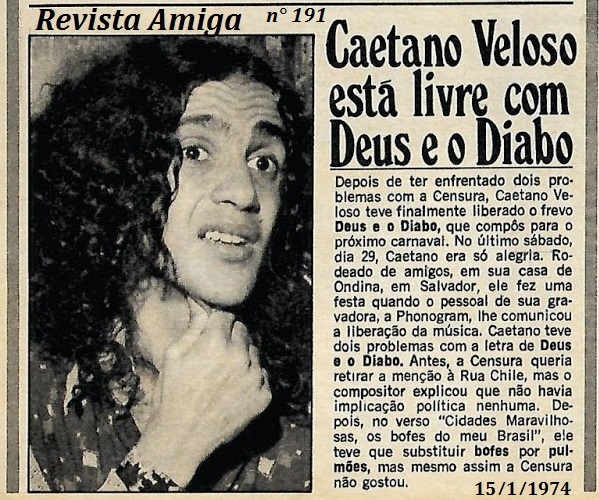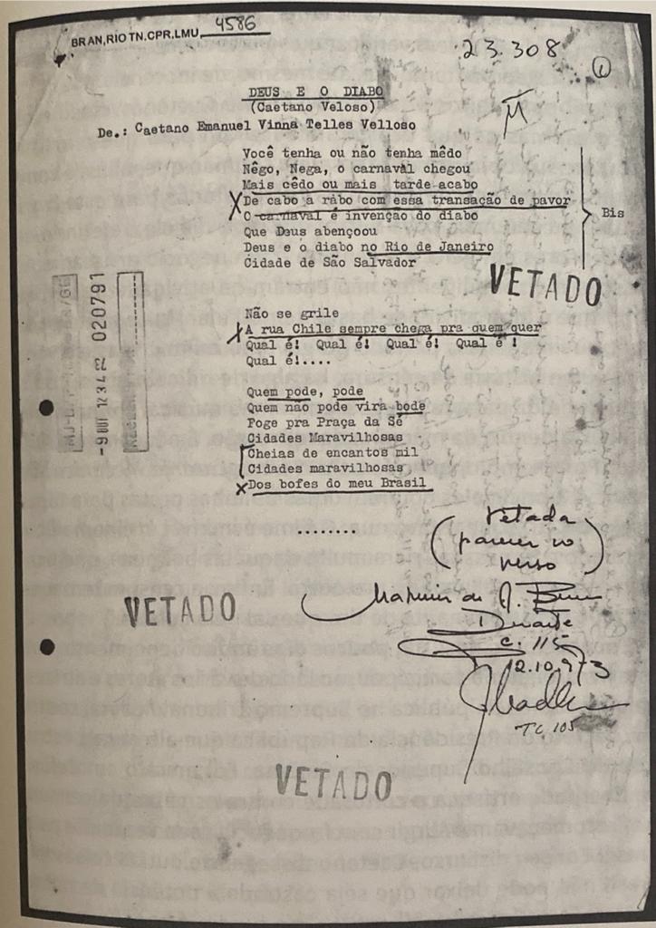Voltando ao tempo das vacas gordas da censura, em 1973, a marchinha “Deus e o Diabo” foi outra composição de Caetano a gerar atrito com os censores, que muitas vezes se colocavam na condição de educadores, tutores da sociedade – como se esta fosse uma criança indefesa que precisa ser protegida da realidade. A música foi vedada e, no verso do documento oficial com o parecer do censor, há a seguinte justificativa: