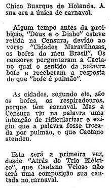 Conversando sobre a censura a “Deus e o Diabo”, Caetano se lembra do contratempo com a palavra “bofes”, mas não com os outros versos: “Eles falaram que não poderia ficar o verso Os bofes do meu Brasil; e eu disse:Mas bofe quer dizer pulmão. Eu estou dizendo que são os pulmões do Brasil.Eles achavam que “bofe” era uma palavra chula. As atrizes de teatro rebolado chamavam os homens, os caras que elas pegavam, de bofes e as bichas adotaram essa gíria das vedetes. Eu botei Os bofes do meu Brasil’ na letra, que tem um ar de conversa de bicha, mas, ao mesmo tempo, era porque eu estava dizendo: Rio de Janeiro/Cidade de São Salvador/ os pulmões do meu Brasil. Então, eu falei: Se vocês estão grilados com a palavrabofes, eu boto pulmões’ mesmo... E tem uma vantagem: do ponto de vista da prosódia, pulmões’ fica até melhor, porquebofestem um defeito de prosódia. Sobre os outros versos nunca me disseram nada. Pode ser que eles tivessem essas questões lá entre eles, mas nunca chegarem até mim. Só chegou o bofe. Eu mudei pra pulmões’ e a música foi liberada. Agora, ´O carnaval é invenção do Diabo que Deus abençoou` é uma coisa subversiva para o lado católico que eles tinham, mas não me pediram pra mudar isso, não.”